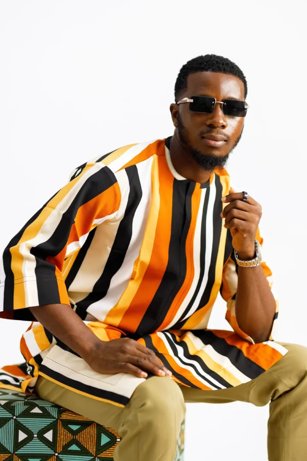 Step into bold energy with the Sunset Rhythm Tunic, a high-impact, Afro-modern piece that radiates warmth, style, and personality. Featuring vertical stripes in burnt orange, golden mustard, ivory, and black, this top captures the rhythm of African sunsets and city life all in one look. The wide three-quarter sleeves and relaxed fit offer comfort, movement, and a confident silhouette.