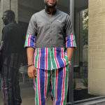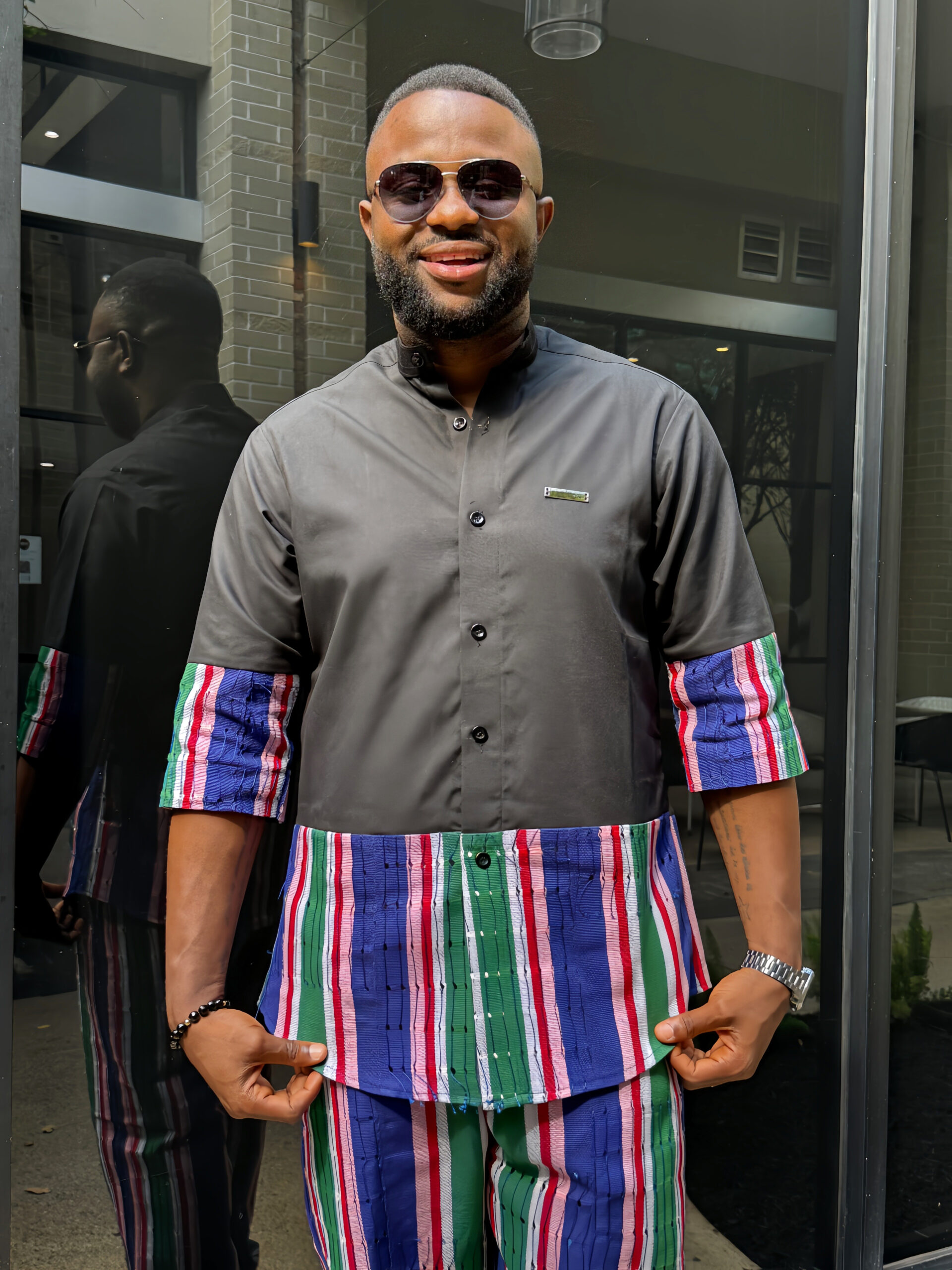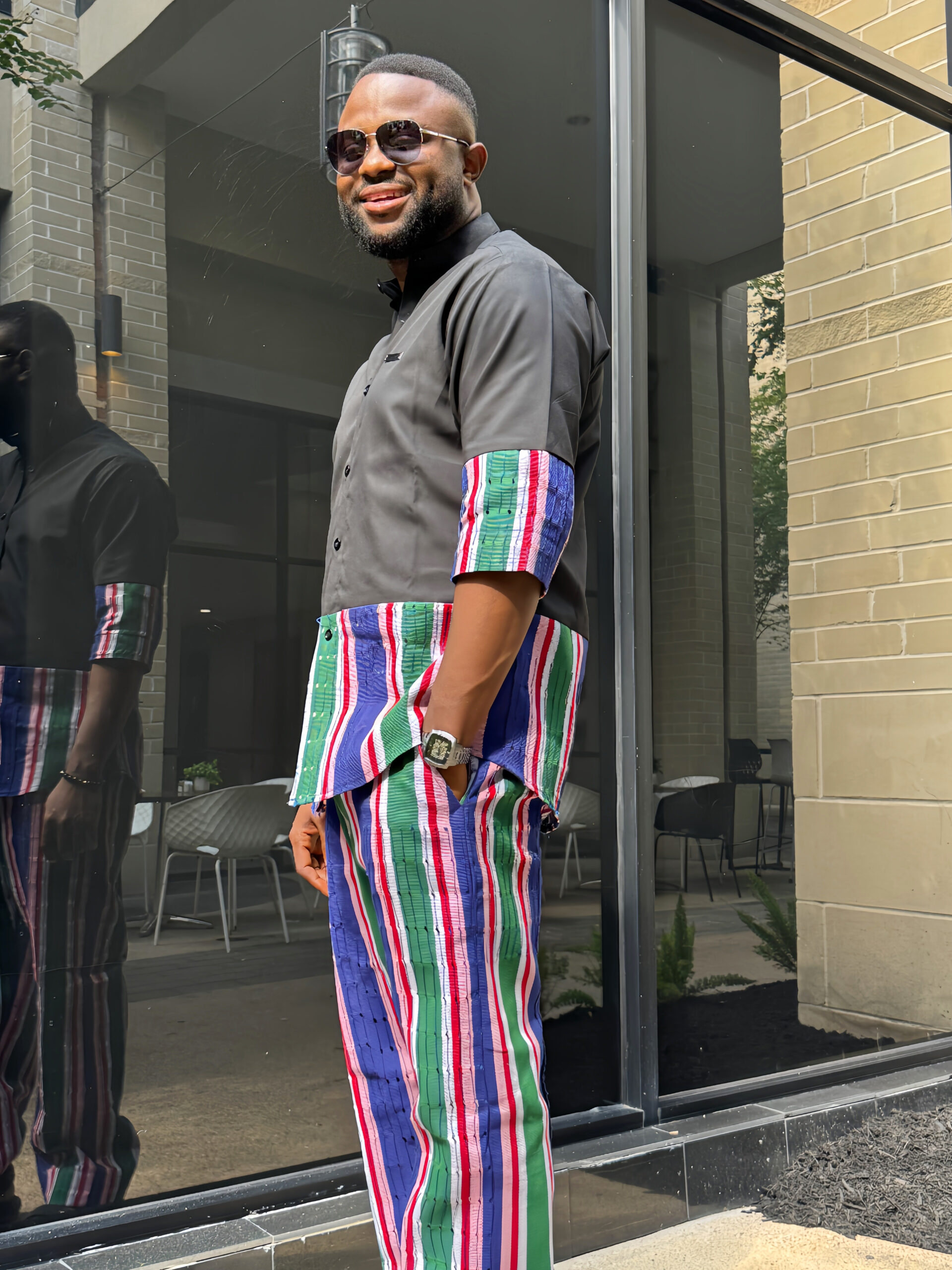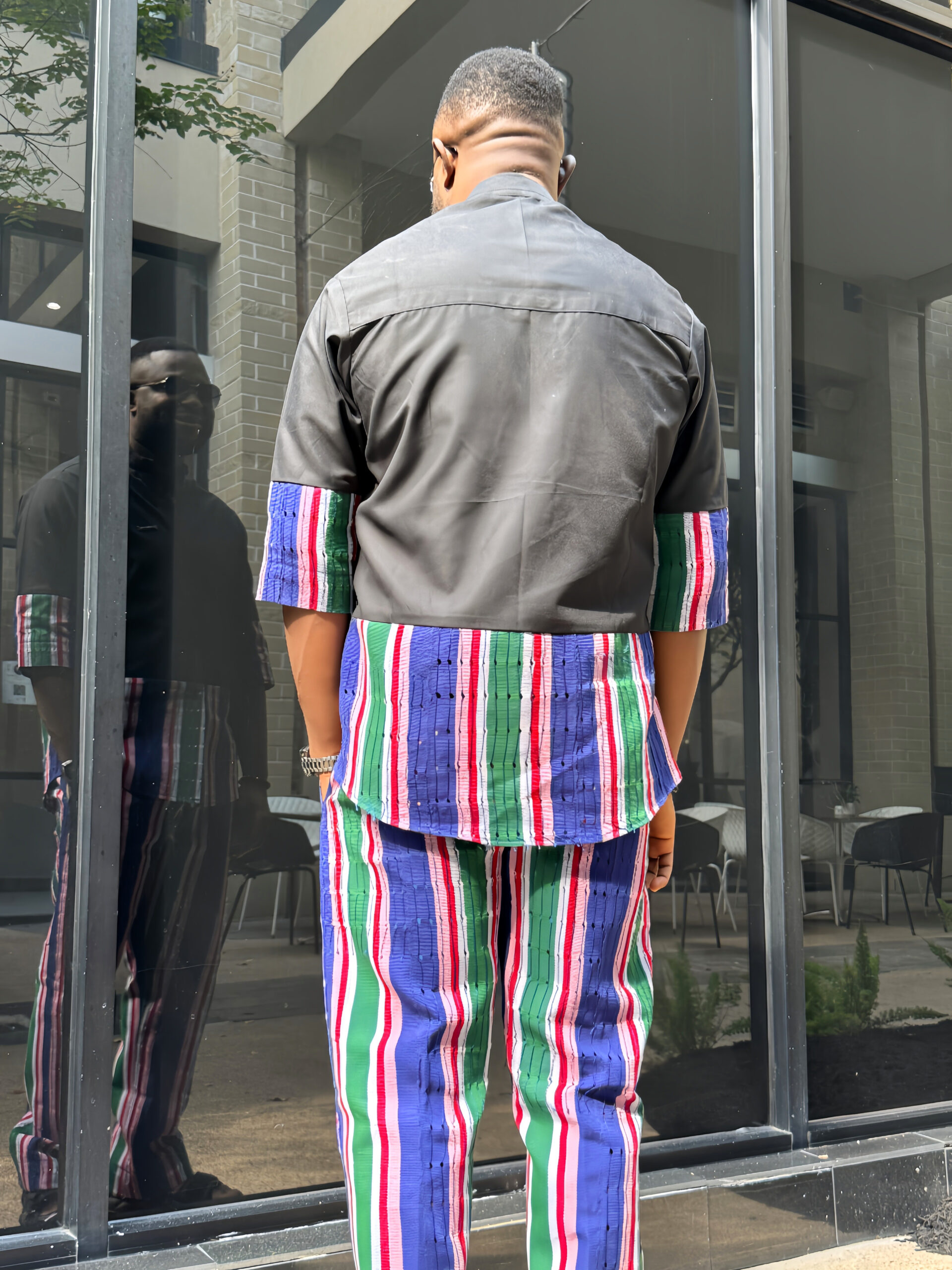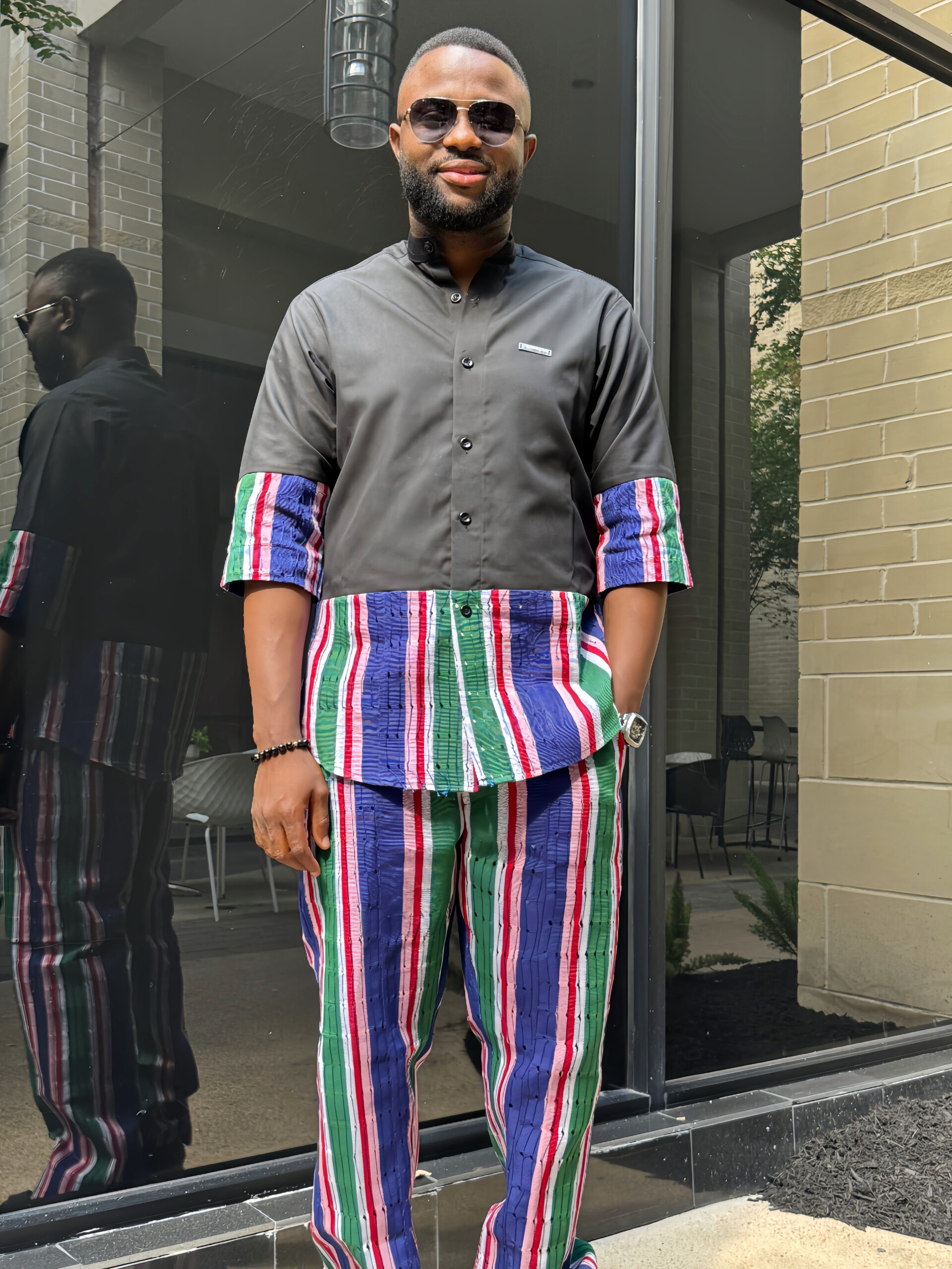 A masterfully tailored shirt combining two complementary fabrics for a striking contrast that catches the eye. Paired with rich, textured Aṣọ Oke pants a nod to Yoruba heritage reimagined with a contemporary fit. Best worn to weddings, evening receptions, fashion events, or anywhere you need to own the room without saying a word.