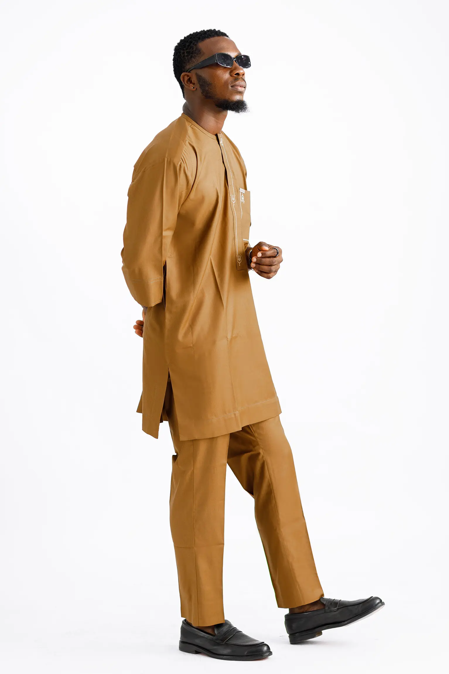 Ignite quiet confidence with The Ember Set, a rich, earth-toned ensemble designed for the man who moves with intention. Crafted in a warm gold-brown hue, this set blends traditional tailoring with a clean, modern silhouette.
